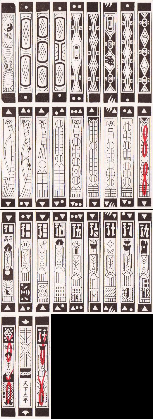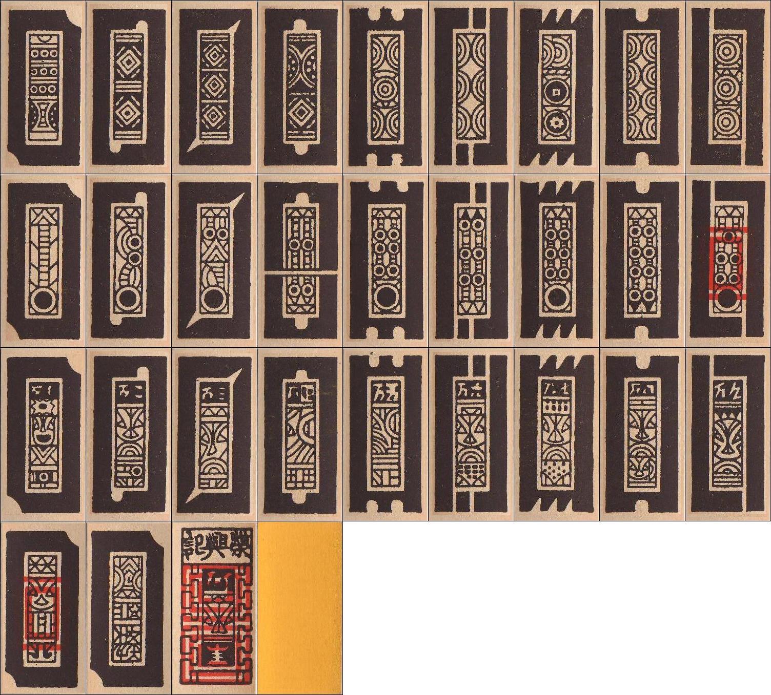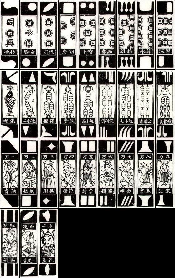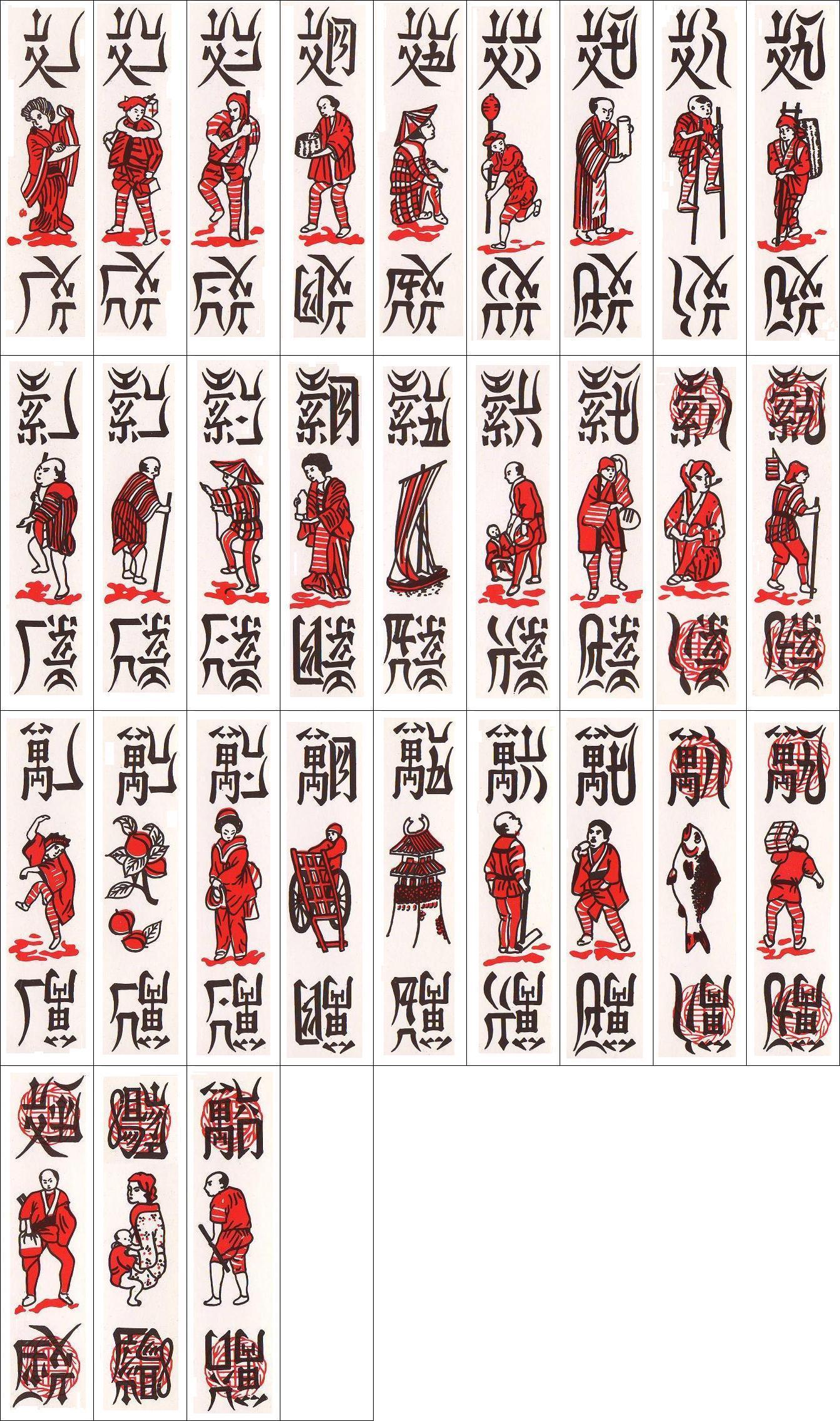 Later, cards based on chinese characters were invented, they are called Han Cards. Each card is associated with a chinese character, often highly stylized. |