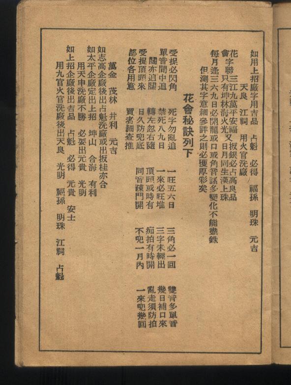 但測其字意細參詳之則必獲厚彩矣 | 花會秘訣列下 | 受捉必閃角 死字勿亂追 一旺五六日 三角必一回 雙音多單音 |