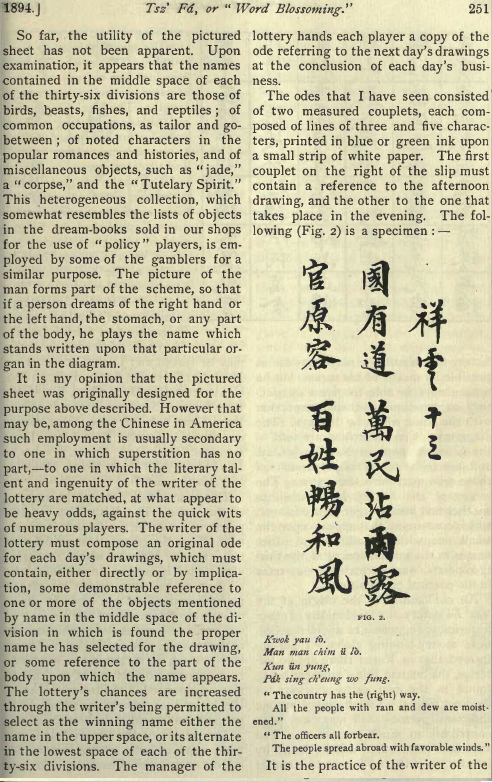 The odes that I have seen consisted of two measured couplets, each composed of lines of three and five characters, printed in blue or green ink upon a small strip of white paper. The first couplet on the right of the slip must contain a reference to the afternoon drawing, and the other to the one that takes place in the evening. The following (Fig. 2) is a specimen :