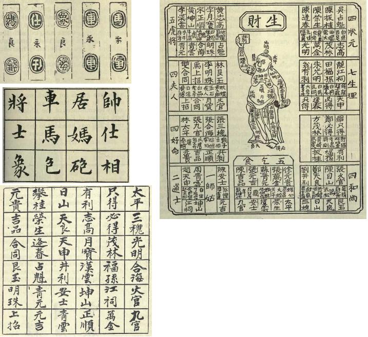 So far, the utility of the pictured sheet has not been apparent. Upon examination, it appears that the names contained in the middle space of each of the thirty-six divisions are those of birds, beasts, fishes, and reptiles ; of common occupations, as tailor and gobetween ; of noted characters in the popular romances and histories, and of miscellaneous objects, such as "jade," a "corpse," and the "Tutelary Spirit." This heterogeneous collection, which somewhat resembles the lists of objects in the dream-books sold in our shops for the use of "policy" players, is employed by some of the gamblers for a similar purpose. The picture of the man forms part of the scheme, so that if a person dreams of the right hand or the left hand, the stomach, or any part of the body, he plays the name which stands written upon that particular organ in the diagram.